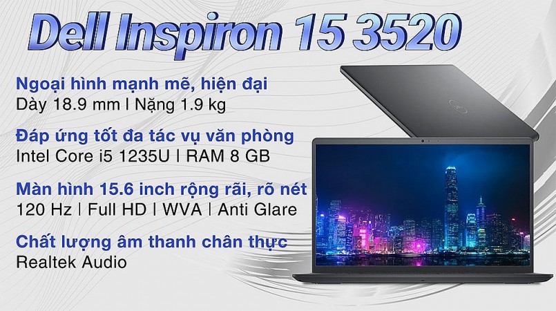 Sản phẩm máy tính giá rẻ cho sinh viên đáng mua cuối cùng xuất hiện trong top list này chính là Dell 3520. Máy được trang bị cấu hình cao với chip i5 đời 12 mang hiệu năng mạnh mẽ, đa nhiệm làm việc văn phòng mượt mà, bạn cũng có thể giải trí tốt với các tựa game nhẹ như LOL.