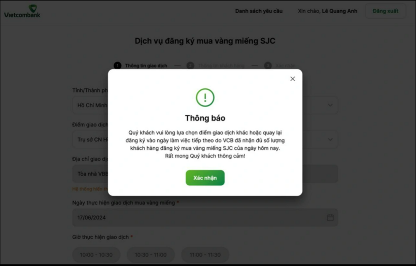 Theo ghi nhận, hiện nhiều người không thể đăng ký mua vàng, tình trạng này diễn ra thường xuyên tại trang thông tin của các ngân hàng. Nhiều khách hàng nhận được hiển thị “đã hết lượt đăng ký trong ngày” hoặc “đã nhận đủ số lượng khách hàng đăng ký mua vàng miếng SJC của ngày hôm nay”.
