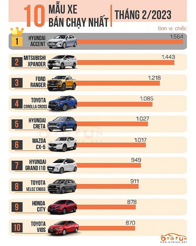 Có mặt trong top 10 xe bán chạy nhất vẫn là những cái tên quen thuộc, được khách hàng ưa chuộng thời gian gần đây. Hyundai Accent 2 tháng liên tiếp dẫn đầu, trong khi đối thủ cạnh tranh ở phân khúc B là City và Vios chốt phía cuối BXH.