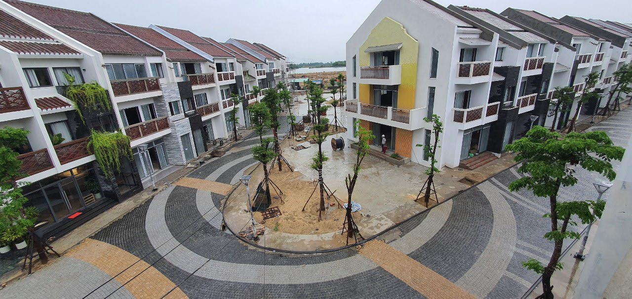 Một dự án bất động sản nghỉ dưỡng khác là Hoian D’or (TP. Hội An) thi công mặt ngoài khu shophouse để bàn giao cho khách từ cuối tháng 7/2022, đang thi công cảnh quan, thi công khách sạn…