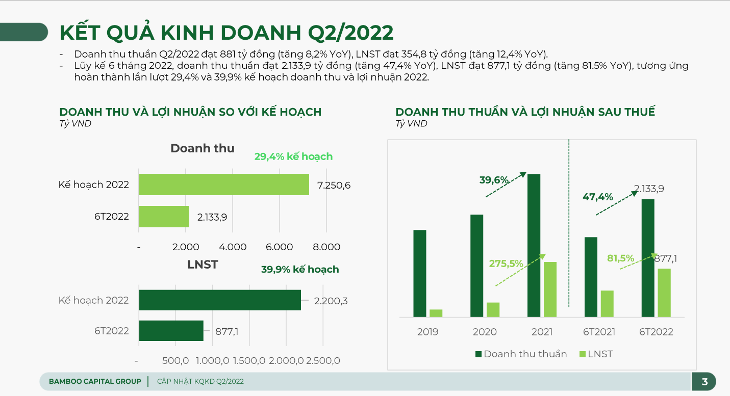 Sau 6 tháng, Bamboo Capital hoàn thành 30% kế hoạch doanh thu và 40% kế hoạch lợi nhuận song ban lãnh đạo Tập đoàn tự tin sẽ về đích kế hoạch năm vì các dự án bất động sản có điểm rơi lợi nhuận vào quý III và quý IV năm nay.