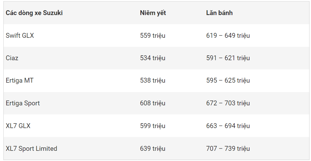Bảng giá các loại xe ô tô Suzuki tháng 11/2023