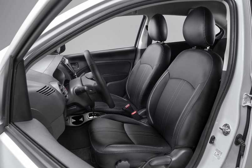 Hàng ghế trước Attrage có tính năng chỉnh cơ 6 hướng ở ghế lái và 4 hướng ở ghế hành khách. Bản Attrage CVT được bố trí thêm bệ để tay cho ghế lái.