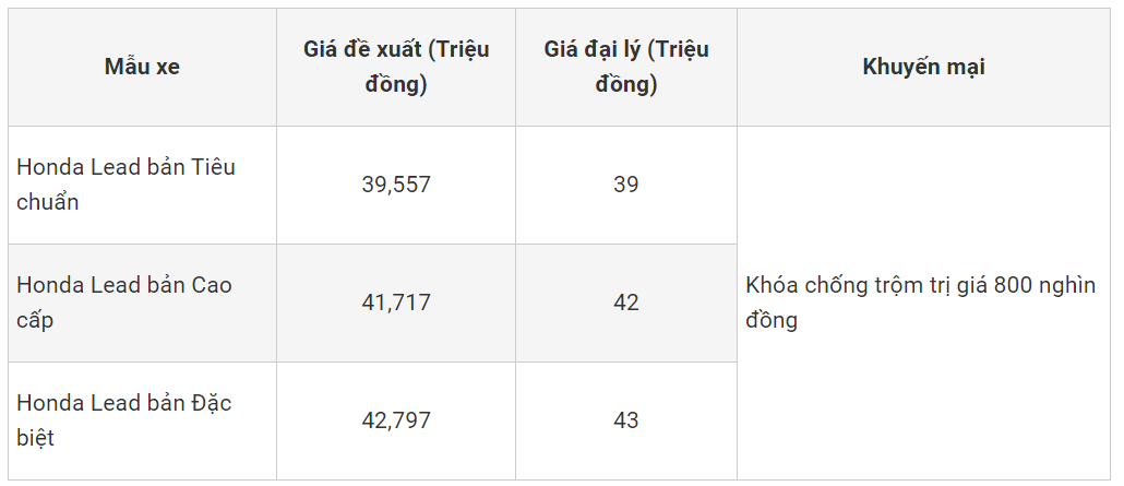 Khảo sát một HEAD Honda ở khu vực ngoại thành Hà Nội cho thấy, giá xe tay ga Honda Lead được đại lý bán ra ở mức dao động từ 39-43 triệu đồng. Bên cạnh mức giá hấp dẫn, HEAD Honda này còn bán Lead kèm theo khuyến mại là bộ chống trộm trị giá 800 nghìn đồng. Nếu khách hàng không muốn lấy bộ chống trộm này, thì đại lý sẽ trừ thẳn vào tiền xe cho người mua.