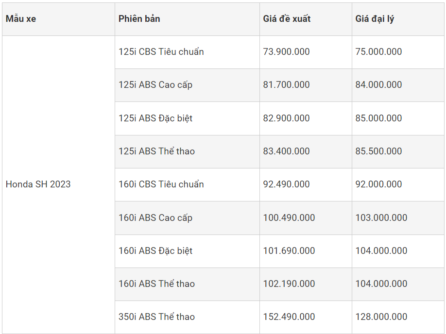 Lưu ý: Bảng giá Honda SH nêu trên chỉ mang tính chất tham khảo. Khách hàng có thể trực tiếp đến các đại lý Honda Uỷ nhiệm (HEAD) để nắm được mức giá chính xác nhất.