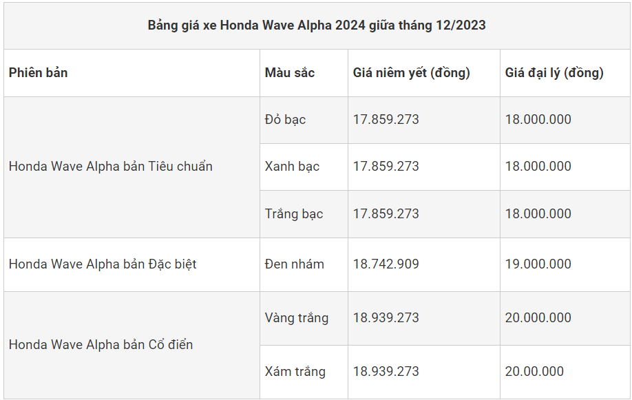 Hiện, Wave Alpha đang được bán ra thị trường với 3 phiên bản cùng mức giá đề xuất bán lẻ dao động từ 17,9 – 18,9 triệu đồng. Cụ thể: