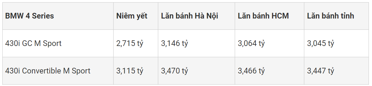 BMW 4 Series là mẫu xe ô tô hạng sang cạnh tranh trực tiếp với Mercedes C-class, Audi A5 Coupe. Xe ở Việt Nam được phân phối với 2 phiên bản là Gran Coupe và Convertible (Mui Trần). So với các “anh em” cùng nhà, thiết kế của BMW 4 Series đại diện cho ngôn ngữ mới của hãng, thu hút và đem đến cảm giác thể thao, sang trọng.