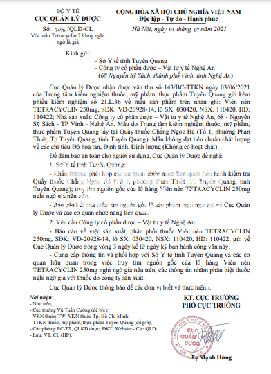 Yêu cầu Công ty cổ phần dược – Vật tư y tế Nghệ An: Báo cáo về việc sản xuất, phân phối thuốc Viên nén TETRACYCLIN 250mg, SĐK: VD-20928-14, lô SX: 030420, NSX: 110420, HD: 110422, gửi về Cục Quản lý Dược trong vòng 3 ngày kể từ ngày ký ban hành công văn này.