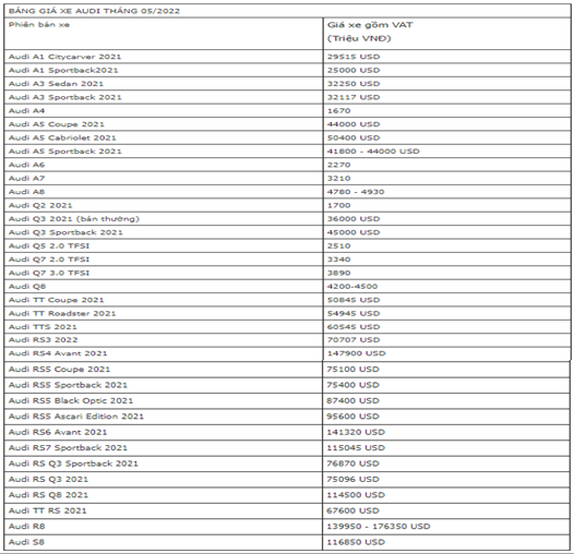| Bảng giá xe ô tô Audi mới tháng 5/2022 |
