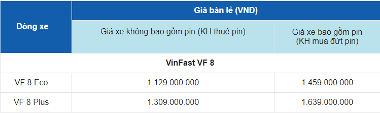 Bảng giá xe ô tô điện VinFast VF 8 giữa tháng 7/2023