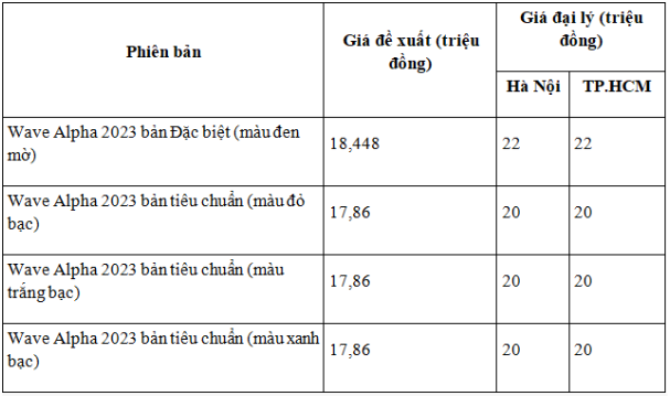 Càng về cuối năm thị trường xe máy đang có chiều hướng nhộn nhịp trở lại, so với giá bán của tháng trước đó, giá xe Honda Wave Alpha 2023 hiện đang dao động từ 20 - 22 triệu đồng. Trong đó, phiên bản đặc biệt màu đen nhám hiện đã ngừng sản xuất nên đang có giá bán lên tới 22 triệu đồng.