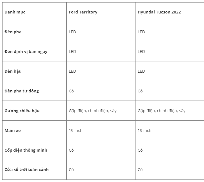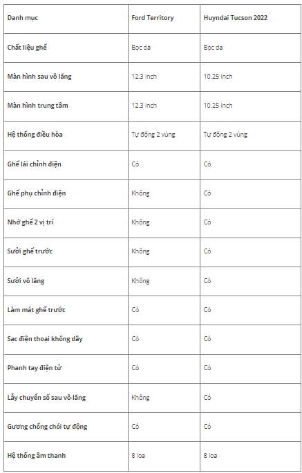 Dù chưa có những clip đánh giá khả năng vận hành và sử dụng ngoài thực tế, nhưng sau đây sẽ có một bài so sánh nhỏ ở hai phiên bản đầy đủ nhất của hai mẫu xe này là Ford Territory Titanium X và Hyundai Tucson 1.6L Turbo 2022, với giá bán lần lượt 935 triệu đồng và 1,020 tỷ đồng.