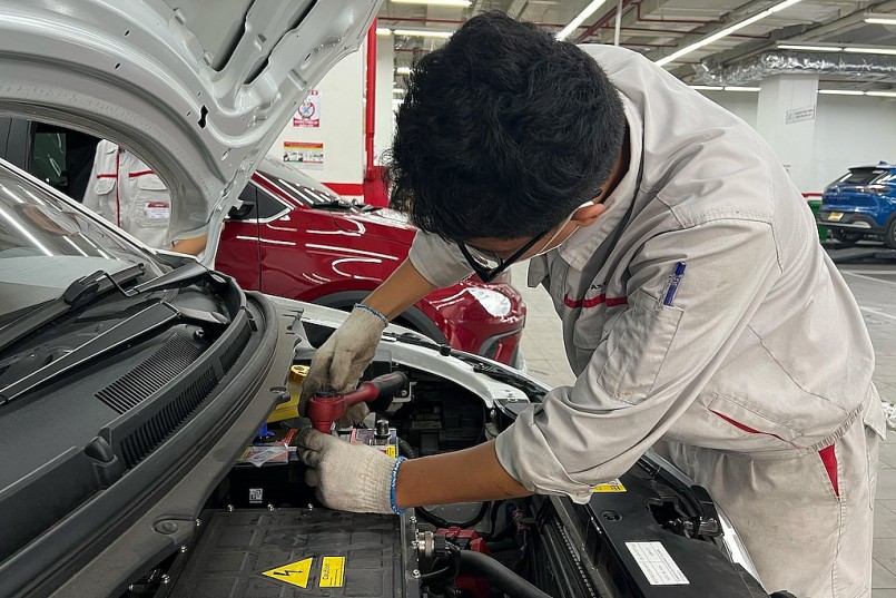 | Kỹ thuật viên VinFast đang thay thế ắc quy mới cho khách hàng. |