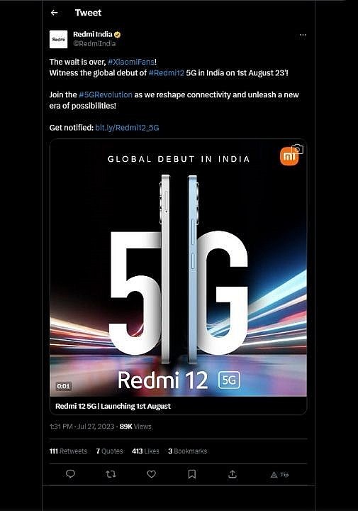 Mới đây, Tập đoàn công nghệ Trung Quốc đã chia sẻ trên Twitter xác nhận ngày ra mắt của Redmi 12 5G và sẽ được công bố lần đầu tiên tại Ấn Độ và sẽ mở rộng ra thị trường khác trong thời gian tới. Thiết bị hứa hẹn sẽ tiếp diễn sự thành công của phiên bản Redmi 12 4G trước đó.