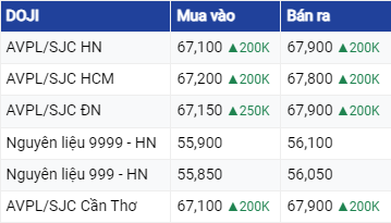 Tập đoàn Doji và hệ thống cửa hàng Bảo Tín Minh Châu, giá vàng trong nước cùng tăng 200.000 đồng/lượng ở cả hai chiều mua vào và bán ra, niêm yết ở mức 67,10 triệu đồng mua vào – 67,90 triệu đồng/lượng bán ra.