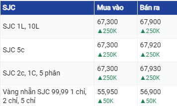 Cụ thể như sau, tại Công ty VBĐQ Sài Gòn SJC niêm yết giá vàng mua vào 67,30 triệu đồng/lượng; bán ra là 67,90 triệu đồng/lượng, tăng 250.000 đồng/lượng ở cả chiều mua vào và bán ra so với mở cửa phiên giao dịch sáng cùng ngày. Chênh lệch giá mua - bán vàng SJC duy trì ở mức 600.000 đồng/lượng.