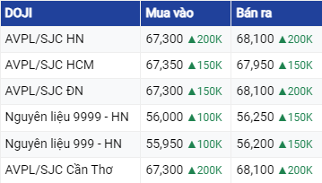 Còn lại, tại Tập đoàn Doji, Vàng Doji HN niêm yết giá vàng ở mức 67,3- 68,1 triệu đồng/lượng, tăng 200.000 đồng/lượng so với phiên liền trước.