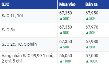 Khảo sát cho thấy, Công ty Vàng bạc Đá quý Sài Gòn đang mua vàng SJC với giá là 67,35 triệu đồng/lượng và bán ra với giá là 67,95 - 67,97 triệu đồng/lượng, cùng tăng 50.000 đồng/lượng.