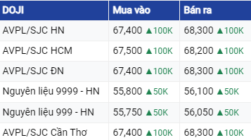 Tại Tập đoàn Doji, giá vàng trong nước tăng nhẹ 100.000 đồng/lượng ở cả hai chiều mua - bán, lần lượt lên mức 67,4 triệu đồng/lượng và 68,3 triệu đồng/lượng.