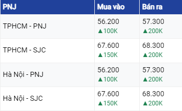 Trong khi hệ thống PNJ đang giao dịch vàng SJC với giá mua - bán tương ứng là 67,6 triệu đồng/lượng và 68,3 triệu đồng/lượng, tăng 150.000 đồng/lượng ở chiều mua vào và tăng 200.000 đồng/lượng ở chiều bán ra so với giá đầu phiên.