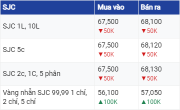 Cụ thể, giá mua - bán tại Công ty Vàng bạc Đá quý Sài Gòn là 67,5 triệu đồng/lượng và 68,1 - 68,12 triệu đồng/lượng, cùng giảm 50.000 đồng/lượng.