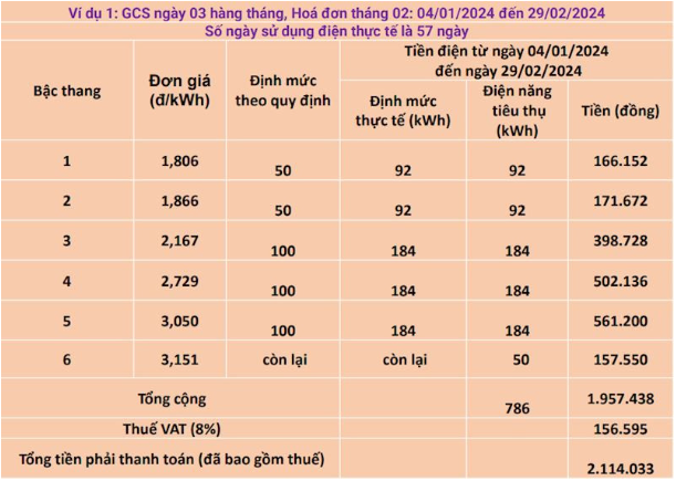 Dưới đây là trường hợp cụ thể một khách hàng thuộc khu vực ghi diện ngày 03 hàng tháng, kể từ tháng 2/2024 chuyển về ghi điện ngày cuối tháng, kỳ hóa đơn sẽ tính toán như sau: