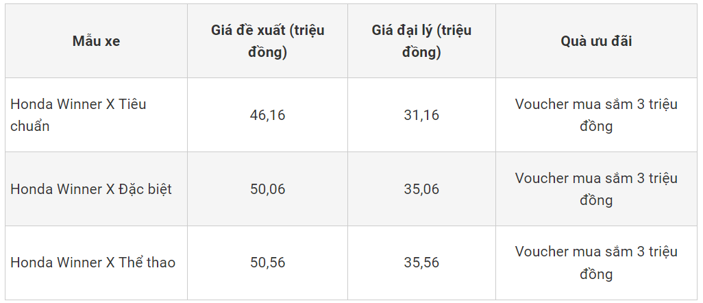 Cụ thể, khảo sát một HEAD Honda phân phối ở Thành phố Hồ Chí Minh và Long An cho thấy, Honda Winner X đang được HEAD này giảm giá tới 15 triệu đồng, không những được giảm giá mà người mua mẫu xe máy này còn được tặng 1 voucher mua sắm trị giá 3 triệu đồng.