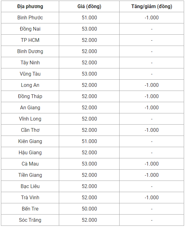 Các tỉnh Long An, Đồng Tháp, An Giang, Cần Thơ, Tiền Giang và Trà Vinh cùng giảm 1.000 đồng/kg về chung mức 52.000 đồng/kg.