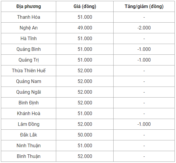 Tương tự, Quảng Bình và Quảng Trị cùng giảm 1.000 đồng/kg xuống còn 51.000 đồng/kg.