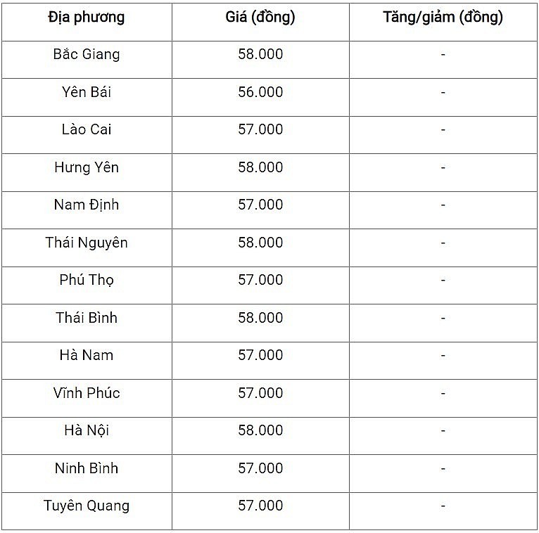 Ngoại trừ tỉnh Yên Bái đang neo tại mức 56.000 đồng/kg, các tỉnh còn lại vẫn duy trì giao dịch tại mức 57.000 đồng/kg.