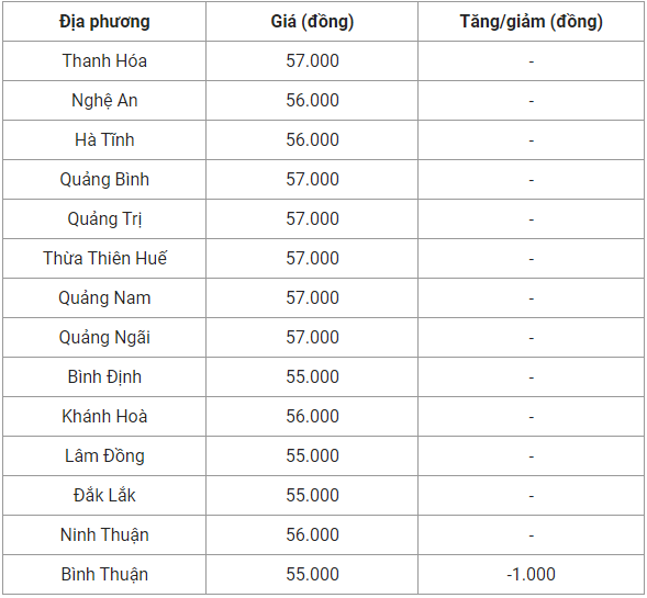 Riêng tỉnh Bình Thuận điều chỉnh giảm 1.000 đồng/kg xuống còn 55.000 đồng/kg.
