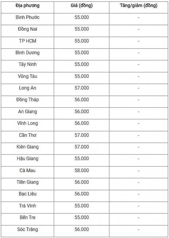 Hiện tại, các tỉnh thành gồm Bình Dương, Tây Ninh, Vũng Tàu, Trà Vinh và Bến Tre cùng hạ nhẹ một giá xuống còn 55.000 đồng/kg.