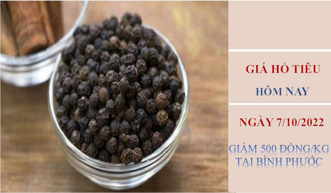 Giá hồ tiêu hôm nay 7/10/2022, ghi nhận thị trường trong nước giảm 500 đồng/kg ở Bình Phước, đi ngang ở các địa phương còn lại so với cùng thời điểm hôm qua. Hiện giá hồ tiêu đang dao động trong khoảng 61.500 - 64.500 đồng/kg.