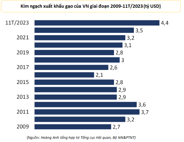 Lũy kế 11 tháng năm nay, xuất khẩu gạo đạt gần 7,8 triệu tấn, tương ứng 4,4 tỷ USD, tăng 16% về lượng và tăng 36% về giá trị so với cùng kỳ năm 2022.