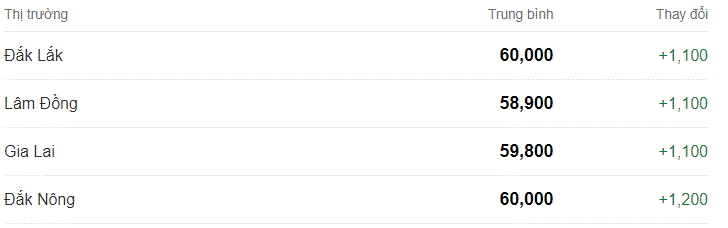 Giá cà phê cao nhất thu mua ở các vùng trọng điểm của Tây Nguyên (Đắk Lắk, Lâm Đồng, Gia Lai, Đắk Nông, Kon Tum) được ghi nhận ở mức 60.000 đồng/kg.