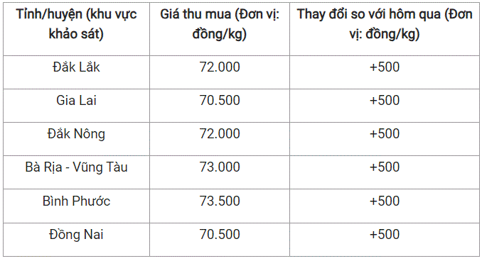 Kế đến là hai tỉnh Đắk Lắk và Đắk Nông với chung mức giá là 72.000 đồng/kg.