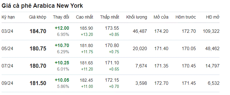Giá cà phê arabica giao tháng 3/2024 tại New York ở mức 184,7 US cent/pound sau khi tăng 6,95% (tương đương 12 US cent) tại thời điểm khảo sát vào lúc 7h00 (giờ Việt Nam).