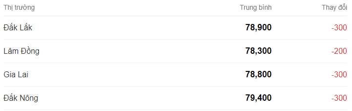 Theo đó, tỉnh Lâm Đồng có giá thấp nhất là 78.300 đồng/kg. Kế đến là tỉnh Gia Lai với 78.800 đồng/kg.