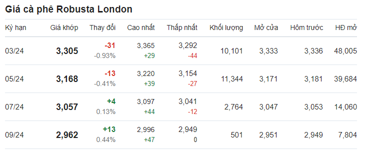 Theo ghi nhận, giá cà phê trên thị trường thế giới tăng. Theo đó, giá cà phê trực tuyến robusta tại London giao tháng 3/2024 được ghi nhận tại mức 3.305 USD/tấn sau khi giảm 0,93% (tương đương 31 USD).