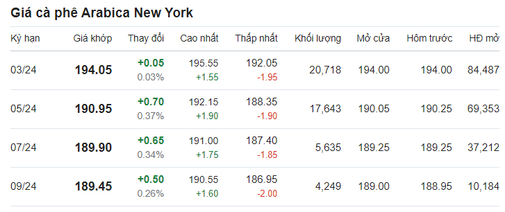Giá cà phê arabica giao tháng 3/2024 tại New York ở mức 194,05 US cent/pound sau khi tăng 0,03% (tương đương 0,05 US cent) tại thời điểm khảo sát vào lúc 6h40 (giờ Việt Nam).