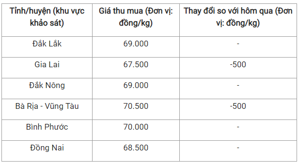 Trong đó, mức giá được ghi nhận tại Gia Lai và Đồng Nai lần lượt là 67.500 đồng/kg và 68.500 đồng/kg.
