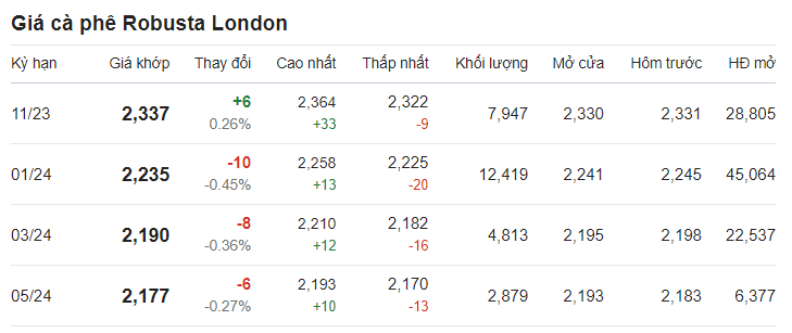 Theo ghi nhận, giá cà phê trên thị trường thế giới tăng. Theo đó, giá cà phê trực tuyến robusta tại London giao tháng 11/2023 được ghi nhận tại mức 2.337 USD/tấn sau khi tăng 0,26% (tương đương 6 USD).
