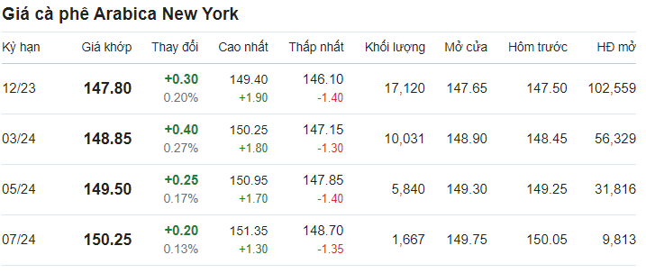 Giá cà phê arabica giao tháng 12/2023 tại New York ở mức 147,80 US cent/pound sau khi tăng 0,20% (tương đương 0,3 US cent) tại thời điểm khảo sát vào lúc 7h00 (giờ Việt Nam).