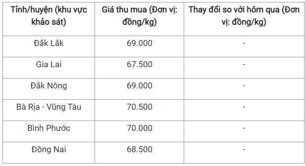 Tiếp theo đó là hai tỉnh Đắk Lắk và Đắk Nông được áp dụng mức giá 69.000 đồng/kg.