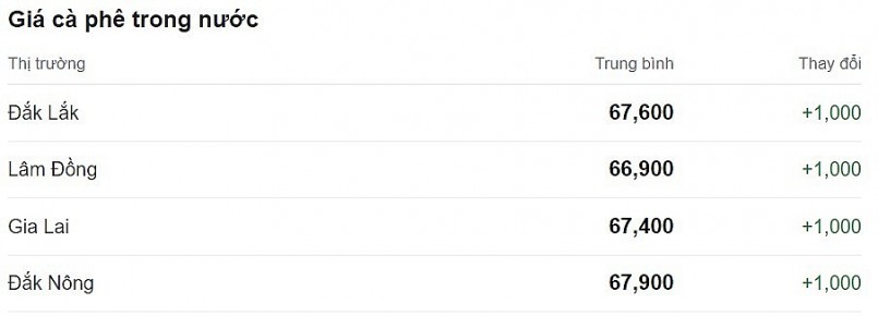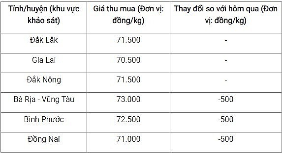 Theo đó, tỉnh Lâm Đồng có giá thấp nhất là 66.900 đồng/kg. Kế đến là tỉnh Gia Lai với 67.400 đồng/kg.