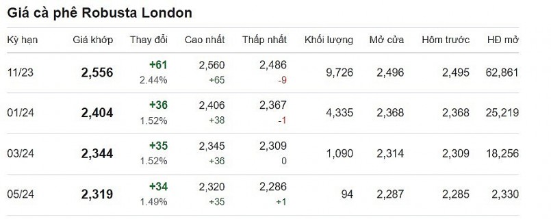 Theo ghi nhận, giá cà phê trên thị trường thế giới tăng. Cụ thể, giá cà phê trực tuyến robusta tại London giao tháng 11/2023 được ghi nhận tại mức 2.556 USD/tấn sau khi tăng 2,44% (tương đương 61 USD).