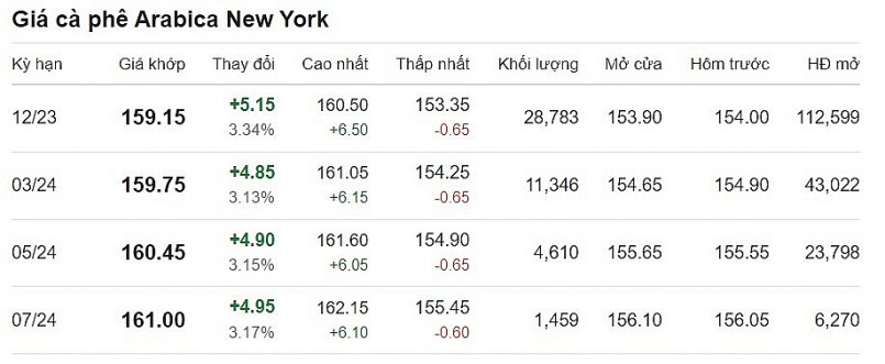 Giá cà phê arabica giao tháng 12/2023 tại New York ở mức 159,15 US cent/pound sau khi tăng 3,34% (tương đương 5,15 US cent) tại thời điểm khảo sát vào lúc 6h45 (giờ Việt Nam).