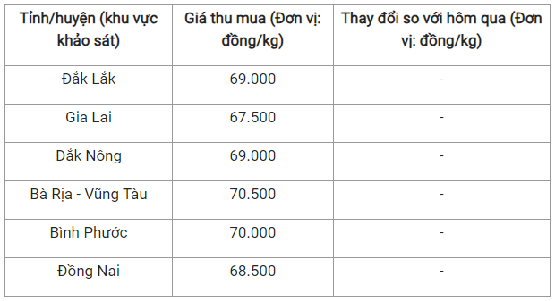 Hai tỉnh Đắk Lắk và Đắk Nông tiếp tục ghi nhận cùng mức giá thu mua là 69.000 đồng/kg.