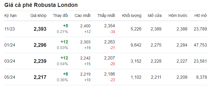 Theo ghi nhận, giá cà phê trên thị trường thế giới biến động trái chiều. Theo đó, giá cà phê trực tuyến robusta tại London giao tháng 11/2023 được ghi nhận tại mức 2.393 USD/tấn sau khi tăng 0,21% (tương đương 5 USD).
