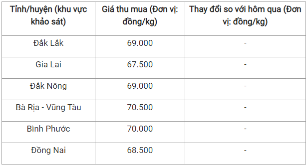Hiện tại, mức giá thấp nhất được ghi nhận là 67.500 đồng/kg tại tỉnh Gia Lai, cao hơn một chút là 68.500 đồng/kg tại tỉnh Đồng Nai.